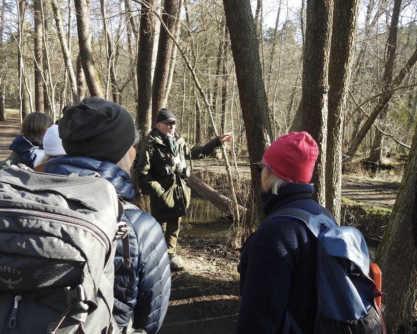 Ända sedan 1991 har Henrik Waldenström lett Tisdagsklubben på fågelskådningar i Nationalstadsparken. På vandring genom Liljansskogen till Fiskartorpet den 14 april fick vi bland annat se och höra tre exemplar av mindre hackspett, vårsjungande svartmes, och knäppande stenknäckar. Gärdsmyg, rödhake och taltrast överröstade varandra och Henrik Waldenström lärde gruppen att höra skillnad på dem och alla de andra fåglar som vi mötte.